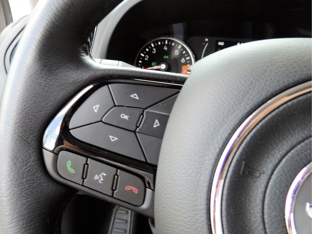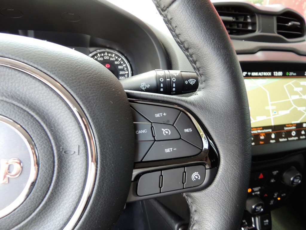 Adaptive cruise control is een comfortabele en veilige optie. Het systeem reguleert de snelheid en houdt automatisch afstand tot uw voorligger. U kunt het audiosysteem met DAB-ontvangst en het full map navigatiesysteem bedienen met de knoppen op het stuur. Met de automatische airconditioning selecteert u de gewenste temperatuur. Het systeem doet de rest. De parkeersensoren waarschuwen wanneer u te krap inparkeert of dat ene paaltje niet hebt gezien. Deze Jeep Renegade is voorzien van keyless entry, waardoor de portieren en achterklep vanzelf open gaan als u in de nabijheid komt. Met automatisch dimmende binnenspiegel, lederen stuur en centrale deurvergrendeling met afstandsbediening is deze Jeep helemaal compleet.
